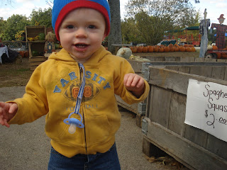 We went to Jackson's Orchard (see Lewis cheering above) for our annual quest for fun and fall pictures. It was a bit chilly, but we had a great time. It was Owen's first time out and about where he actually got to walk around some. He really liked it!